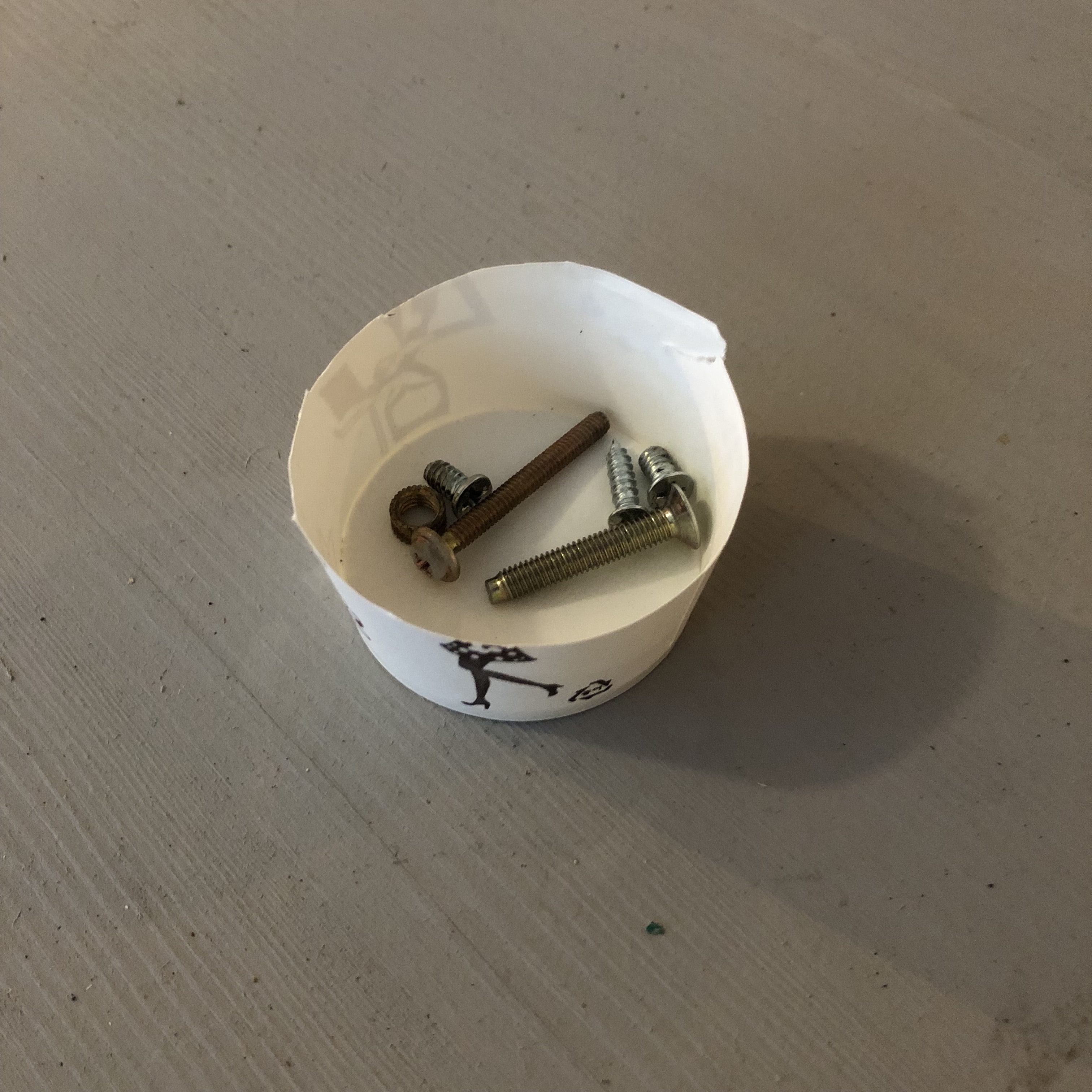 고무 호스를 휴지 포장 비닐로 묶은. 나사못들이 종이컵 안에 모인. 철사끈을 일회용 나무 젓가락에 묶은.양철통 안에 들어간. 결과물 일지 기간 2025.9.24. –  유형 디지털 이미지 용량 -